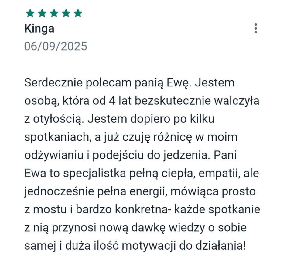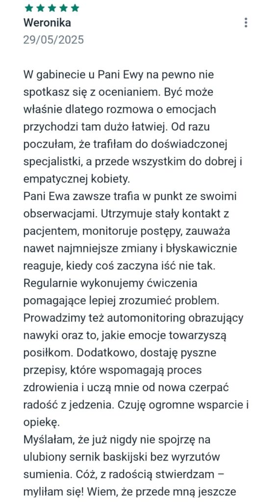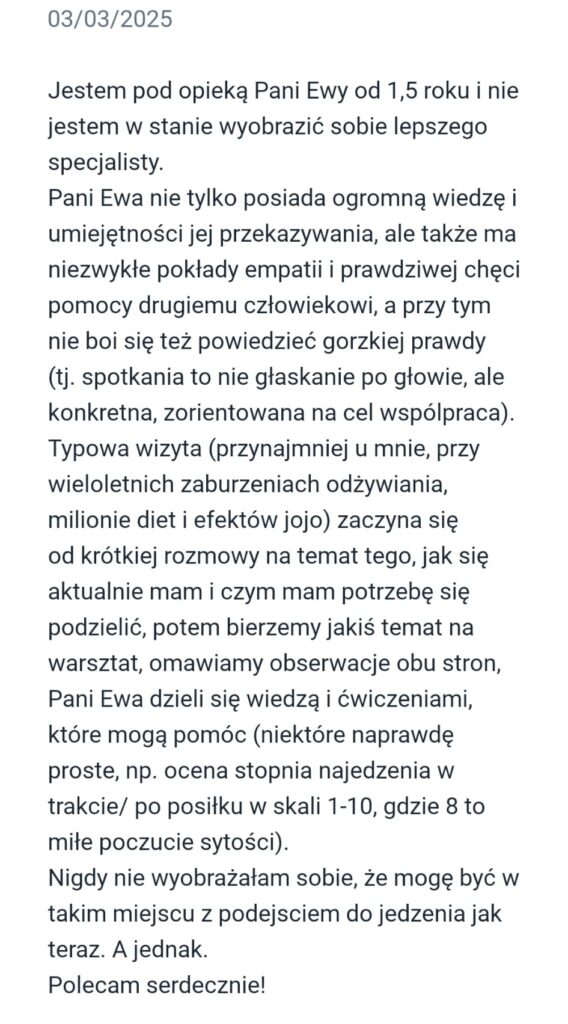 “Pani Ewa jest bardzo empatyczną, spokojną i wyrozumiałą osobą. Spotkania odbywają się w przyjaznej i bezpiecznej atmosferze, wprowadzane są ćwiczenia w celu lepszego zrozumienia problemu i pracy nad nim. Nie są to spotkania z dietetykiem, który da wytyczne, rozpisze plan diety i tyle. W przypadku pracy z Panią Ewą sięga się do głębszych warstw w celu zrozumienia z czego wynikają problemy z odżywaniem, a następnie wprowadzenie zmian i zdrowych nawyków. Bardzo serdecznie polecam osobom, które chcą wprowadzić długotrwałe zmiany w swoim życiu i odżywianiu”